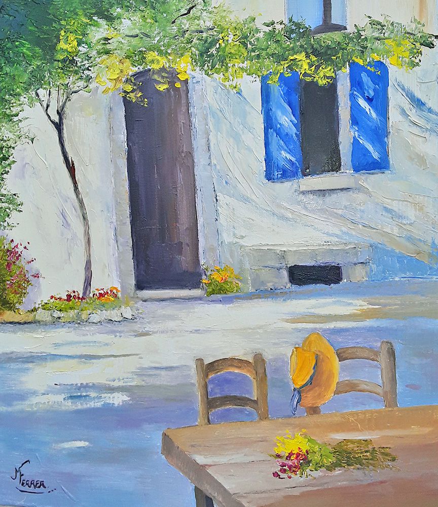 Loin d'un réalisme figé, Jean-Marie Ferrer propose une écriture puissante et suggestive. La technique du couteau permet de transmettre le ressenti de la chaleur du soleil sur le crépi et la sérénité d'un moment de repos à l'ombre. C'est une œuvre d'émotions qui invite le spectateur à prendre place dans ce décor bucolique.