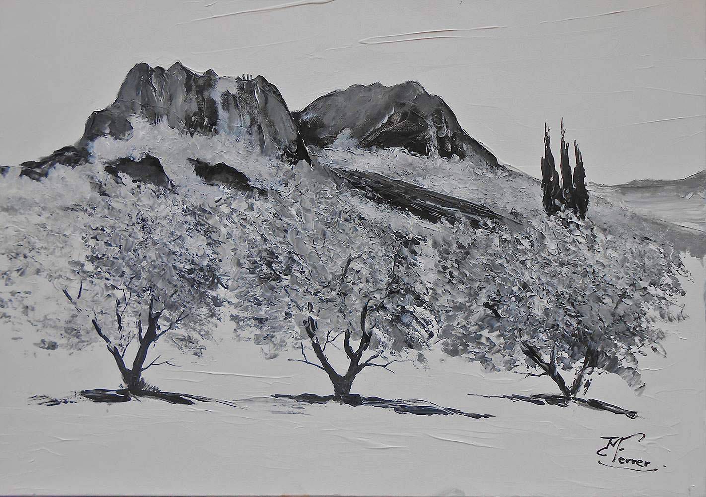 Peinture à l'huile au couteau: Le rocher de Roquebrune en noir et blanc